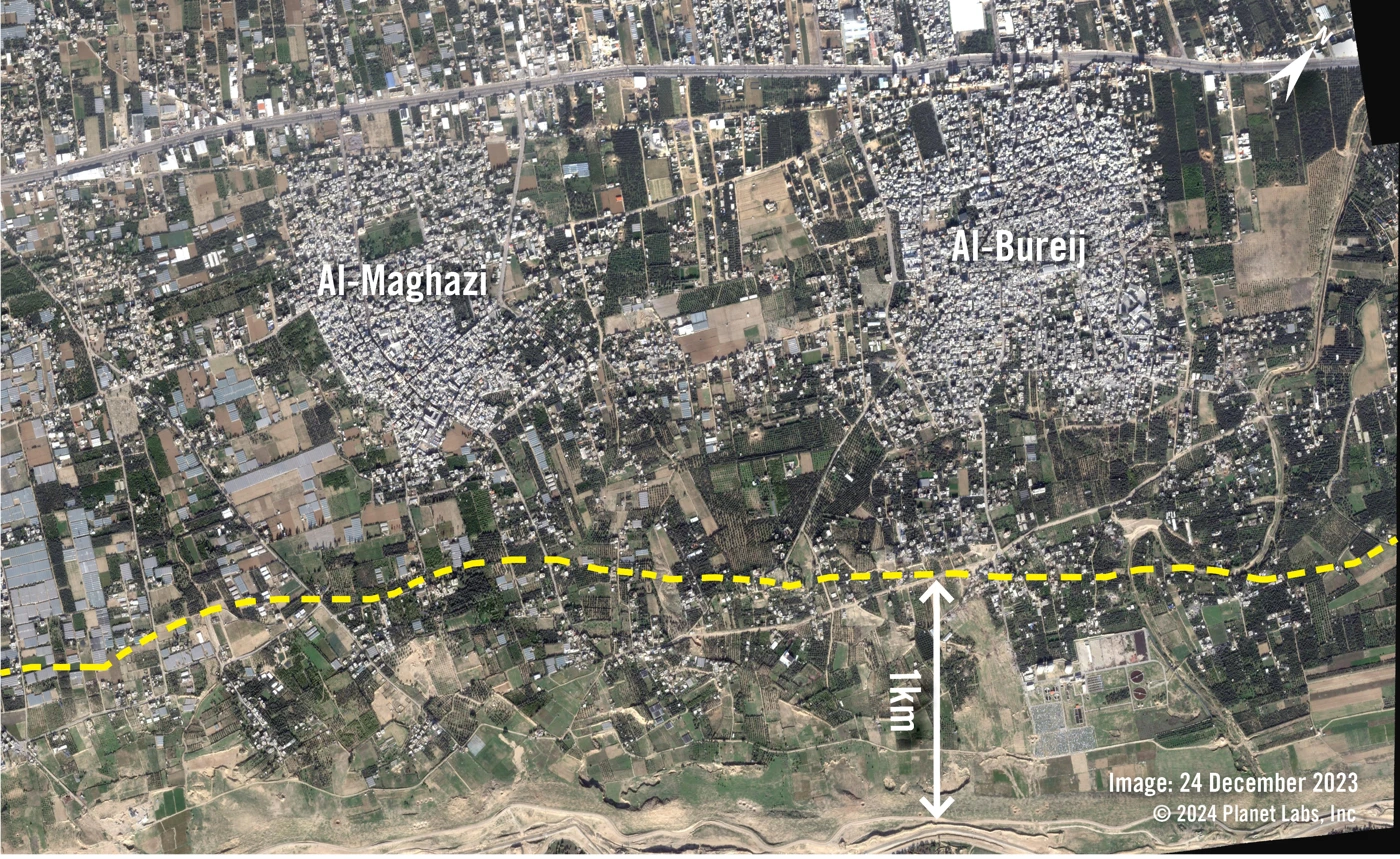Die erweiterte „Pufferzone“ entlang der Grenze zu Israel umfasst rund 58 km², was etwa 16 % des gesamten besetzten Gazastreifens entspricht. Im Mai 2024 schienen mehr als 90 % der Bauten in diesem Gebiet (mehr als 3.500 Gebäude) zerstört oder schwer beschädigt zu sein. Auf mehr als 20 km² bzw. 59 % der landwirtschaftlichen Flächen in dieser Gegend wuchsen aufgrund des anhaltenden Konflikts weniger und kränkere Nutzpflanzen.