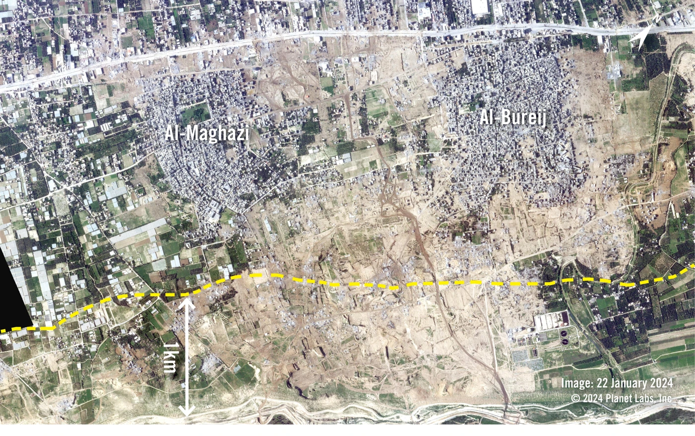 Durch die Analyse von Satellitenbildern und Videos, die von israelischen Streitkräften zwischen Oktober 2023 und Mai 2024 in Sozialen Medien gepostet wurden, konnte das Crisis Evidence Lab von Amnesty International entlang der östlichen Grenze des Gazastreifens einen neu gerodeten Landstrich identifizieren, der zwischen 1 km und 1,8 km breit ist. In einigen Videos sind israelische Armeeangehörige zu sehen, die für Fotos posieren oder auf den Abriss von Gebäuden anstoßen.