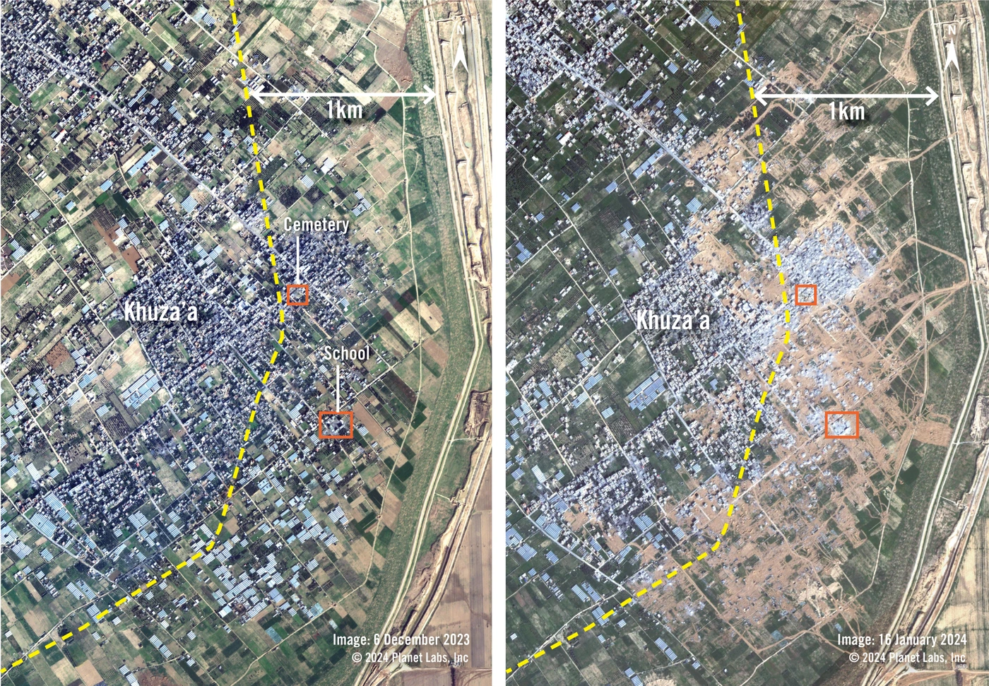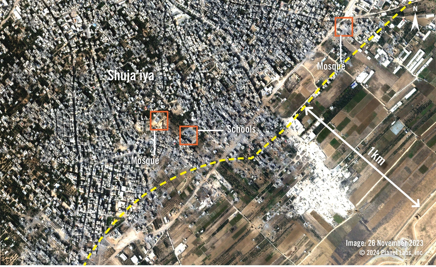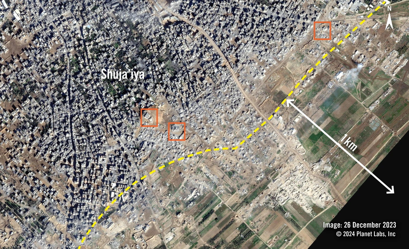 Israelische Behörden haben eingeräumt, dass es nach den Angriffen vom 7. Oktober 2023 durch die Hamas und andere bewaffnete palästinensische Gruppen aus Sicherheitsgründen zur Zerstörung von Gebäuden entlang der Ostgrenze des Gazastreifens gekommen sei, um Menschen in Israel vor weiteren Angriffen zu schützen. Das israelische Militär rechtfertigt den Abriss von Gebäuden im Gazastreifen mit der Angabe, dadurch Tunnel und andere „terroristische Infrastruktur“ zerstört zu haben.