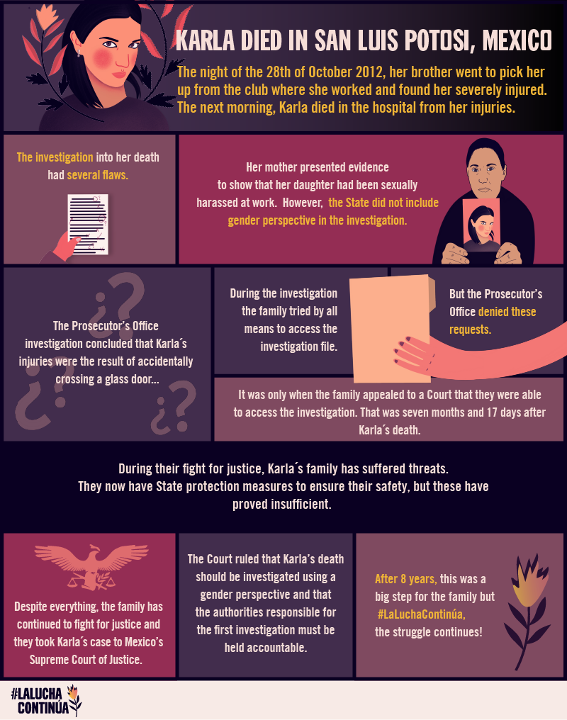 Trotz allem hat die Familie weiter für Gerechtigkeit gekämpft. Der Fall Karla wurde am 1. Juli 2015 vor dem Obersten Gerichtshof Mexikos verhandelt. Vier Jahre später, am 13. November 2019, entschied das Gericht, dass Karlas Tod aus einer geschlechtsspezifischen Perspektive untersucht werden sollte, und ordnete an, dass die für die fahrlässige erste Untersuchung verantwortlichen Behörden zur Rechenschaft gezogen werden sollten.