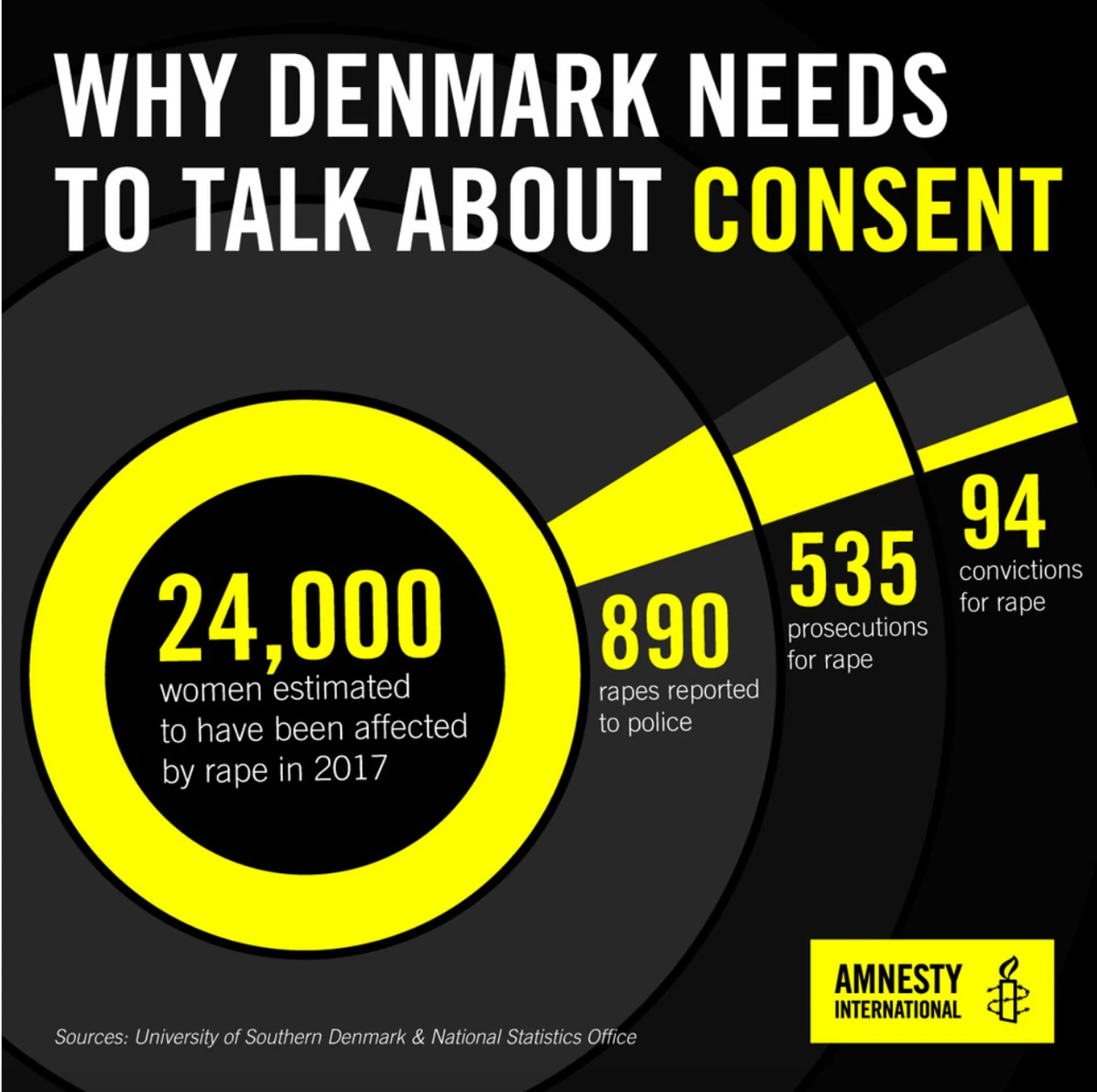 In den anderen europäischen Ländern erfordert das Gesetz, um als Verbrechen zu gelten, beispielsweise Gewalt oder Drohungen. Dies ist jedoch in den meisten Fällen der Vergewaltigung nicht der Fall. Infolgedessen sind viele Überlebende von Vergewaltigungen nicht in der Lage, Gerechtigkeit zu suchen, was zu einem Mangel an Vertrauen in das Rechtssystem führt. Daher entscheiden sich weniger Frauen dafür, sexuelle Gewalt bei der Polizei anzuzeigen, und die Täter kommen frei.